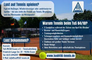 Für alle Tennis-Neueinsteiger sowie für alle, die zukünftig den Tennissport wieder ausüben wollen, bieten wir interessante Angebote. Zum Beispiel kostenloses Schnuppertraining und verschiedene Neueinsteiger-Angebote (für Erwachsene, Jugendliche, Studenten und Azubis). Auch bieten wir ein Angebot für eine passive Mitgliedschaft an. Senden Sie uns eine E-Mail unter “ info@tus8410-tennis.de “ oder rufen Sie uns an (auch …